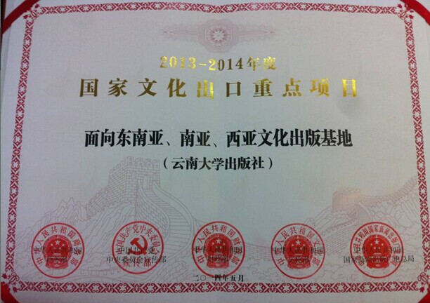 2014年8月云南大学出版社“走出去”出版项目荣获两项奖励。“面向东南亚、南亚、西亚文化出版基地”作为云南大学出版社有限责任公司出版“走出去”的重点项目成功入选国家“新闻出版改革发展项目库”,这是云南大学出版社继2013年之后再次入选。“新闻出版改革发展项目库”于2010年启动建设,是财政部文化产业发展专项资金的重点支持项目,入库项目将优先获得国家文化专项资金的支持和资助。