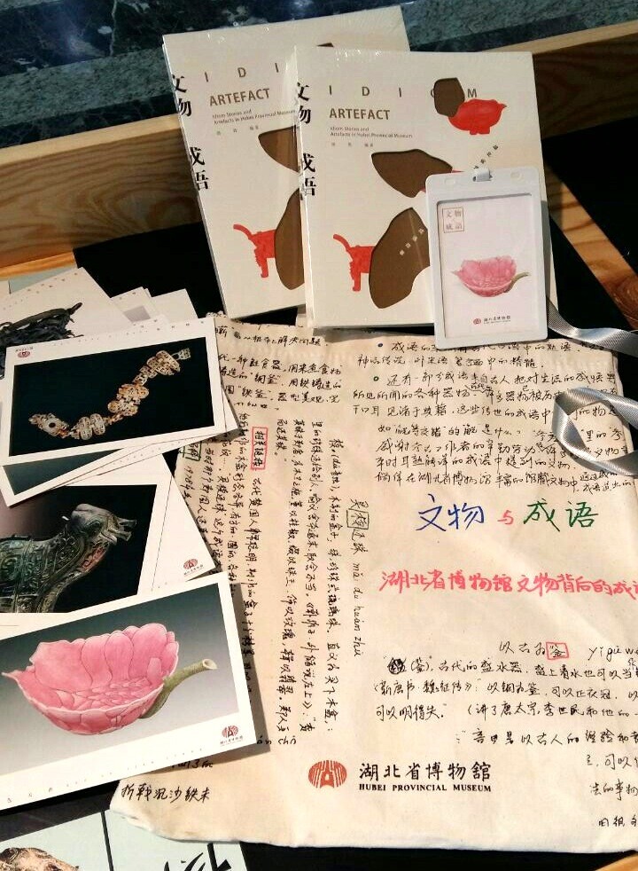 除了宣传图书外,《文物与成语》还随书赠送湖北省美术馆青年艺术家汪鋆设计的具有可读性的“手稿”环保袋、12款文物明信片以及一个讲解挂牌。作者胡昇亲笔书写的成语故事被印制在结实耐用的帆布袋上,倡导大家在日常生活中减少对塑料袋的使用,拒绝白色污染。