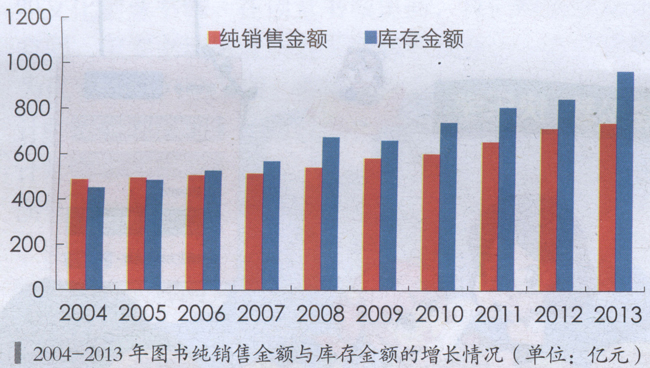 2004-2013年,出版社的库存金额一路飙升。全国新闻出版业基本情况显示,2004年,全国图书纯销售金额为486.02亿元,库存金额为449.13,2005年纯销售金额为493.22亿元,库存金额为482.92亿元,纯销售金额增长了1.5%,而库存金额增长了7.5%,增长幅度是销售金额的5倍。2006年,库存增长速度进一步加快,继2005年增长33.79亿元之后,2006年增长了42.05亿元,增长金额是2005年的1.2倍。除了2009年,库存数量下降O.94%,金额下降2.16%外,2010年以后,库存金额走势呈现“大跃进”,库存金额比上一年呈现了两位数的增长,增长比例为10.060/0。之后一发不可收拾,到了2013年,库存金额达到了964.4亿元,增长幅度是2012年的16.42%,成为库存金额增长最多的一年。