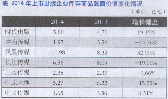 到了2014年,上市出版企业库存商品呈现出“冰火两重天”的现象。2014年上市公司年报显示,7家拥有出版业务的出版上市企业中,中南传媒2014年库存商品下降了-44.76%,而凤凰传媒库存商品上升了32%。其中,201 3年有3家库存商品金额大于201 4年,其他4家的库存商品均比2013年有所降低。从整体情况看,上述7家上市出版企业的平均增长幅度为一3.17%,这得益于上市公司对库存商品管理有严格的跌价计提机制和规范的管控机制,但大部分非上市出版机构目前缺乏计提机制。