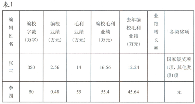 综上,最终纳入衡量编辑工作绩效的指标有毛利、编校字数、业绩增长率、各类奖励四项。编校字数反映编辑的基本劳动数量,毛利表征编辑劳动的经济效益取得情况,业绩增长率表征编辑工作的努力程度及工作推进度,各类奖励反映社会效益获得情况。这四个指标既可以衡量编辑工作产生的实际绩效,也可以反映编辑工作的努力程度,体现该编辑的进取状态,比较适合需要跨部门直接考核编辑个人的考核模式。