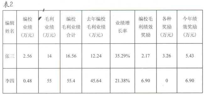 第三步,按照出版社业绩奖励办法,计算出编校毛利绩效奖励数额(如表2)。其中编校毛利绩效奖励=【去年业绩+今年业绩增长部分×(1+业绩增长率)】×绩效奖励系数(假定12%)。