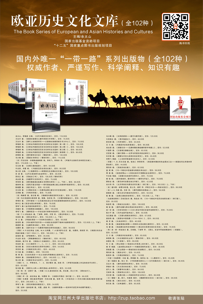“八年磨一剑”!历时八年时间,许多人的呕心沥血,国内外唯一一套覆盖丝绸之路经济带核心地带的系列历史文化出版物“欧亚历史文化文库”终于跟大家见面了!该套丛书已被国内外多家研究机构收藏,并连续有多种图书进入高校出版社书榜,各种图书评论已在国内外学术与读书网站出现,其社会效益必将随着我国“一带一路”战略的推进而彰显出来。 《欧亚历史文化文库》(全102种),首次系统出版内陆欧亚学一百多年的学术成果,重点展现百年来、特别是1978年以来我国学者在内陆欧亚学研究上取得的杰出性代表性成果和当前国际上的难点重点问题,同时也精选了一些为国内学界广为称道的国外学者在这一领域的经典佳作,不但在内容上科学、精谨、严密,更在方法视野上,具有相当的启迪作用,涉及区内众多民族、多种文化类别的语言、文字、风俗、宗教、生产和生活方式等内容及其相互影响,在研究方法和资料构建上独显欧亚视野的优势和特色。