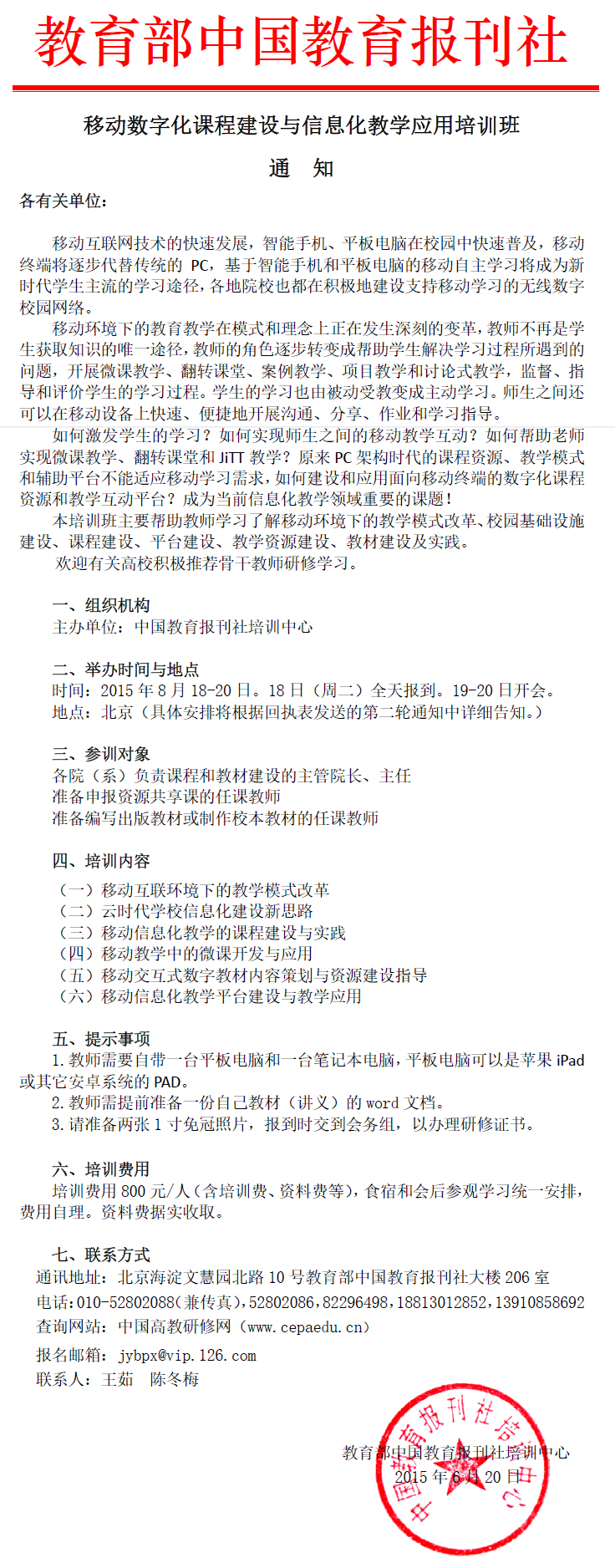 移动数字化课程建设与信息化教学应用培训班 通 知