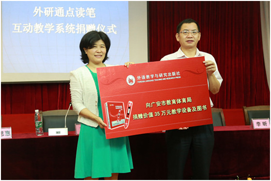 7月2日,由外语教学与研究出版社组织的“外研通点读笔互动教学系统捐赠仪式“在四川省广安市友谊中学实验学校隆重举行。本次活动向广安市50所中小学捐赠了价值35万元的外研通互动教学系统及点读图书。广安市市教育体育局副局长刘中平、外语教学与研究出版社总支书记、副社长王芳出席捐赠仪式并讲话。