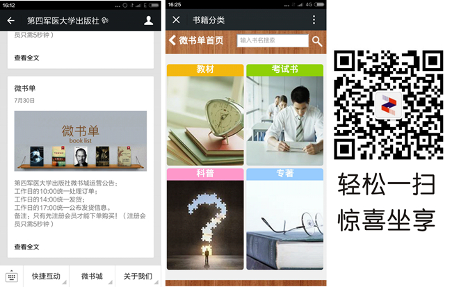 7月29日开始,通过微信购买第四军医大学出版社图书已经变成现实。“微书城”开辟了新的购书途径,能够最直接地使读者和第四军医大学出版社进行在线交流,方便读者购买。