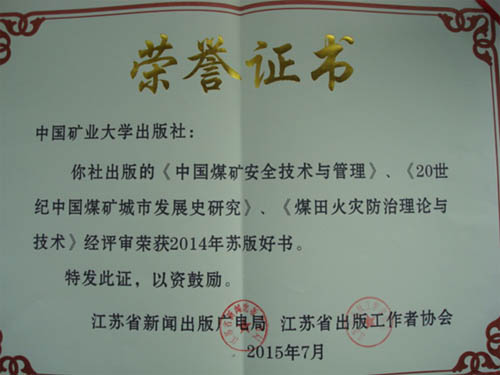 7月15日晚,第五届江苏书展开幕的前夜,由中共徐州市委、市政府主办的“书香徐州·汉时明月”经典诵读活动精彩呈现,揭开了本届书展的序幕。在经典诵读活动正式开始前,进行了“2014苏版好书”颁奖仪式。中国矿业大学出版社副总编辑马跃龙代表矿大出版社上台领奖。“2014苏版好书”奖,全省10家出版社的69种图书获奖,中国矿业大学出版社3种图书榜上有名。这三种图书是《中国煤矿安全技术与管理》、《20世纪中国煤矿城市发展史研究》、《煤田火灾防治理论与技术》。