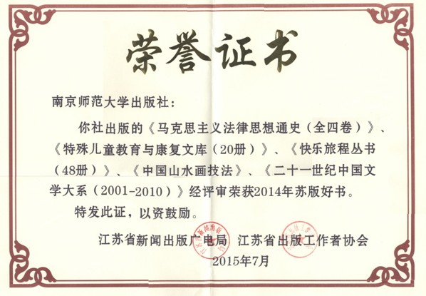 为深入开展全民阅读活动,加快推进书香江苏建设,在全社会形成“多读书、读好书”的文明风尚,省新闻出版广电局、省出版工作者协会开展了“2014年度苏版好书”荐读活动。在全省69种入选图书中,南京师范大学出版社共有5种(91册)图书入选,居全省前列,分别为《马克思主义法律思想通史》(全四卷)《特殊儿童教育与康复文库》(20册)《快乐旅程丛书》(48册)《中国山水画技法》和《二十一世纪中国文学大系(2001—2010)》(18册)。