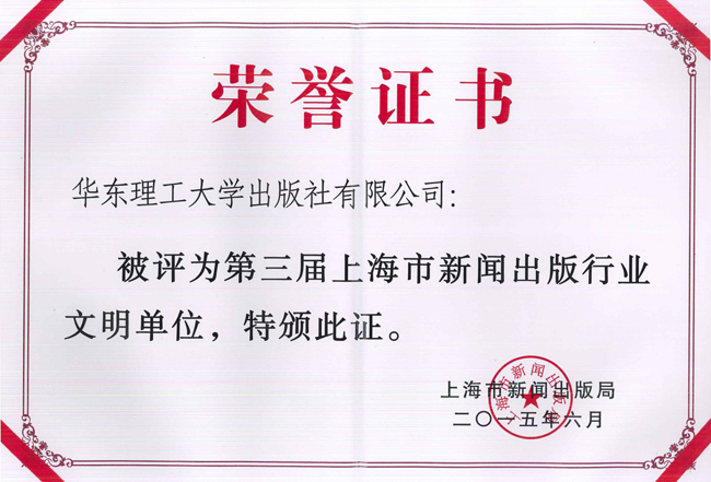 2015年7月21日,上海市精神文明办、上海市新闻出版局表彰了一批上海新闻出版行业文明单位。华东理工大学出版社荣获“第三届上海市新闻出版行业文明单位”荣誉称号,这也是我社第一次获得“文明单位”称号。