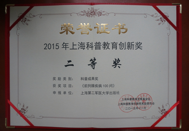 2015年上海科普教育创新奖颁奖典礼于近日在沪举行,一批国家和省部级的重大项目入选上海科普教育创新奖榜单。其中,第二军医大学出版社凭借《前列腺疾病100问》项目荣获二等奖,并在大会上接受了左焕琛理事长的颁奖。