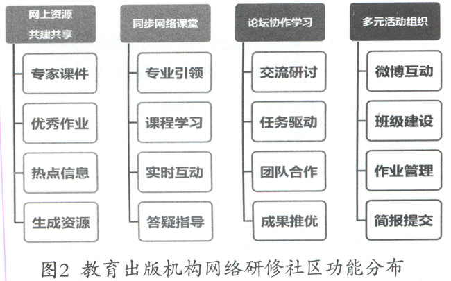 教育出版机构可凭借积累的学术图书资源、课程资源、课题资源、学术期刊资源,开发完善网络研修社区的教学支撑环境,实现网上资源共建、共享功能,同步网络课堂功能,论坛协作学习功能,多元活动组织功能,让学员与专家之间完成网上学习、网上作业、网上答疑,生成教学成果等教学过程,并发布系统公告和各类学习信息(见图2)。