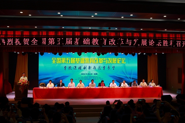 由人民教育出版社与教育部基础教育课程教材发展中心联合主办、深圳市蛇口育才教育集团与人教社报刊社《课程·教材·教法》编辑部承办、深圳大学师范学院与中国教育学会教育学分会等单位协办的“第五届基础教育改革与发展论坛”于2015年11月21—22日在深圳市育才中学召开。人民教育出版社党委书记郭戈、副总编辑王岳、副社长王志刚、总编辑助理赵占良、张廷凯,教育部基础教育课程教材发展中心副主任刘月霞,南方出版传媒股份有限公司总经理杜传贵、副总经理叶河,深圳市教育局副局长范坤,兰州市教育局局长何泳忠,郑州市教育局副局长田保华,深圳市教科院院长叶文梓,南山区教育局副局长李启康,蛇口育才教育集团总校长叶延武等单位的领导和嘉宾出席论坛开幕式,郭戈、杜传贵、范坤、李启康在开幕式上分别致词。张廷凯主持开幕式和第一天上午大会报告。赵占良主持了第二天的大会报告及闭幕式。来自全国各地的中小学校长、教师、科研院所的研究人员以及师范院校的师生共700多人参加了论坛相关活动。