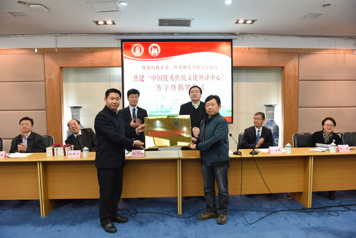 陈永灿校长与徐建中总编签署《西南科技大学•外语教学与研究出版社共建“中国优秀传统文化外译中心”协议》并为“中国优秀传统文化外译中心”揭牌、授牌。