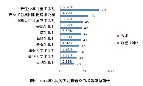据CIP数据统计显示,2016年1季度(1月-3月)共有146家出版单位参与少儿科普图书出版,出版种数共有1170种。依据中图分类法五大部类及二十二个大类的划分,本文选取的少儿科普图书包括自然科学部类的N(自然科学总论)、O(数理科学和化学)、P(天文学、地球科学)、Q(生物科学)、R(医药、卫生)、S(农业科学)、T(工业技术)、U(交通运输)、V(航空、航天)和X(环境科学、安全科学),社会科学部类的E(军事),综合性图书中的科学百科部分,共十二个大类。本文从出版单位、选题结构、引进版等多个角度对数据进行分析。