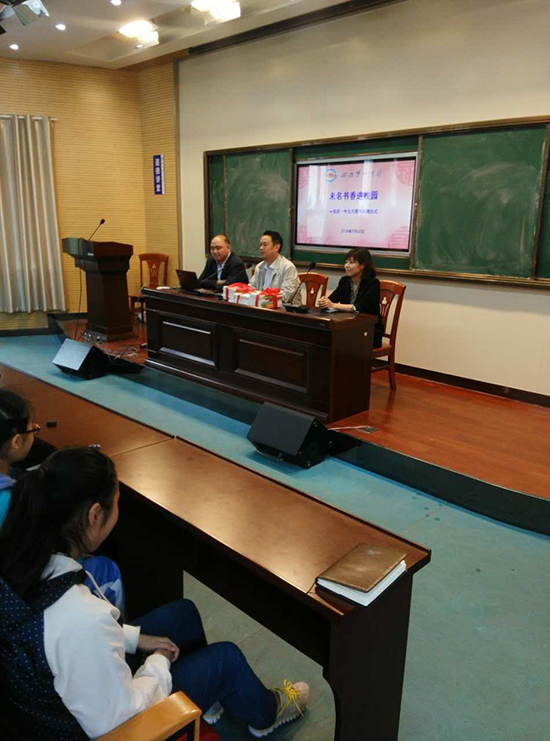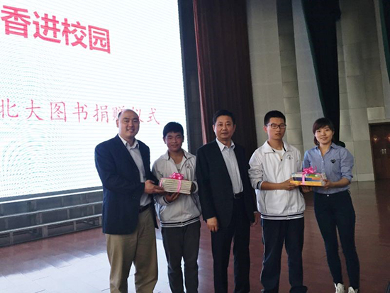 接下来,丁校长代表学校师生接受赠书。北京大学出版社王老师介绍了所赠图书,其中一部分是由北京大学招生办公室主编的历届新生及家长所写的成长感悟与学习方法的《梦想北大系列丛书》,另一部分是适合中学师生阅读的经典读物和优秀图书,希望学生们多读书、好读书、读好书,用心读书,为师弟师妹们留下宝贵的学习经验和高中生活的美好。