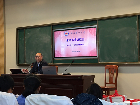 在捐赠仪式上,安庆一中丁校长首先致欢迎辞,对北京大学招生办胡俊老师以及北京大学出版社王慧馨老师的到访表示欢迎和感谢,并对此次活动的意义给予肯定。同时,他号召学生们以北大为梦,读高雅书,做高尚人。