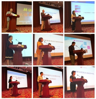 本次研讨会分为四个阶段。北京语言大学出版社总编辑助理张程副编审、新疆职业大学中国语言学院高慧臣院长、莎车县职业技术学校徐鸿副校长、新疆工程学院中国语言系王芙菱副教授先后主持各段学术报告。北京语言大学刘珣教授做了题为“辩证思维与汉语教学原则”的开场报告,提出了结构、功能、文化相结合的汉语教学理念及其指导下的十大教学原则。北京语言大学杨寄洲教授的报告题目是“汉语综合课的课堂教学理念与方法”,他分析了综合课教学的三个阶段与三个层面,并以生动的教学实例来指导一线教师开展综合课教学。接下来,北京语言大学出版社王静老师、复旦大学王景丹副教授、西安外国语大学张丽娜副教授、北京第二外国语学院王涛老师、新疆职业大学曹春梅教授、北京语言大学于淼老师等6位专家,分别就新形势下的汉语教材出版理念、汉语听说读写各课型的教学理念与教学方法、多媒体课件的制作方法和使用技巧等问题做了6场精彩的专题报告,为一线教师展示了先进的教学方法和生动的教学实例。最后,新疆师范大学王阿舒教授做了题为“新疆职业院校汉语教学研究”的报告,从分析新疆应用型院校汉语教学的教学模式、课程设置、教材使用、师资队伍等现状入手,依据职业教育和少数民族应用型人才培养的特点,提出新疆应用型院校汉语教学改革的相关建议及对策。会议最后设置了互动交流环节,为参会教师提供与专家学者零距离研讨交流的机会。