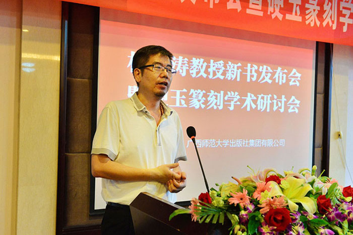 6月14日下午,由广西师范大学出版社主办的林汉涛教授新书发布会暨硬玉篆刻学术研讨会在桂林金龙珠国际大酒店隆重举行。原桂林市地委书记、桂林观石堂鸡血玉博物馆馆长唐正安,原桂林市政协副主席袁绪祥,桂林市书法家协会主席黄家城,原桂林市委宣传部副部长、桂林市文联党组书记余福洲,贺州学院艺术设计学院院长麦茂生,原桂林市文化局局长祝锦炎,原桂林市社科联主席彭源重,桂林旅游局副局长庞铁坚,广西师范大学出版社集团总裁姜革文等来自社会各界的领导和嘉宾应邀出席了本次活动。唐正安、袁绪祥、麦茂生、姜革文先生在发布会上做了热情洋溢的致辞,并为新书揭幕。本次活动还吸引了来自艺术界的诸多人士及书法专业的学生前来观摩聆听,现场座无虚席、气氛热烈。