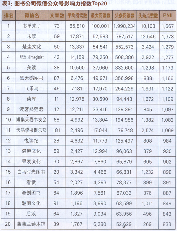 图书公司公号Top20本月度PNII值为1071.85,较上月有较大提升,表现优于出版社公号。图书公司公号Top20中,书单来了蝉联冠军,并缔造了平均阅读数最多(达65810次)、最大阅读数10W+、头条阅读数最大的三项纪录。第二位未读,本月度头条点赞数最多。第11位天鸿读书俱乐部最为勤奋,发文181篇。