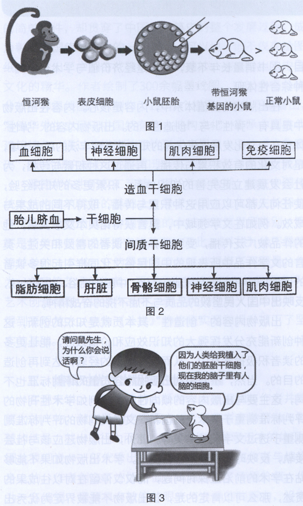 例3:近些年,国内外对干细胞移植的研究从基础研究到临床应用,从血液病治疗到临床多器官系统疾病治疗,范围越来越广。这些信息体现在书中就是信息量大,涉及范围广,内容跳跃。为了配合内容,吸引读者阅读兴趣,使读者能容易读懂科研和临床治疗的内容,我们根据书稿内容设计了相应的卡通插图,如介绍美国的科学家将人类的胚胎干细胞植入实验鼠,使鼠脑中长出了人脑细胞的实验,使人们质疑小鼠拥有人类的脑细胞后是否会变得异乎寻常地聪明?此文配图3。