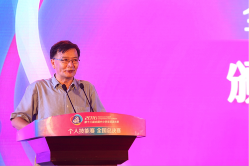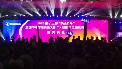 2016年7月22日,由北京外国语大学主办,外语教学与研究出版社承办,全国基础外语教育研究培训中心、英国文化教育协会、网易有道词典、北外国际等机构强强联合举办的2016第十三届“外研社杯”全国中小学生英语大赛全国总决赛在北京圆满落幕。当晚,教育部基础教育二司教育装备处处长乔玉全、文化部民族民间文艺发展中心处长王学文、北京外国语大学副校长贾德忠、外语教学与研究出版社副社长何皓瑜、美国大使馆Education USA高级教育专员刘燕春、全国外语特色校教育研究会理事长孙宝泉等嘉宾及2500多名选手和家长出席了此次大赛颁奖典礼。