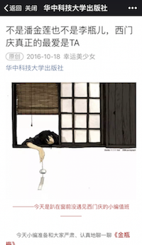 华中科技大学出版社(简称“华中出版”)作为一家以理工类图书出版见长的大学出版社,微信公众号热度指数排名毫不逊色于其他人文社科类大学出版社。每天微信公众号推送的头条文章开篇都会有一幅值班小编“自画像”,或是“梦中化成鱼的小编”,或是“蜗居温暖小窝码字的小编”,又或是“趴在窗前没遇见西门庆的小编”,这种活泼跳脱的风格,让“华中科技大学出版社”这个微信公众号有了自己鲜明的“人格”。