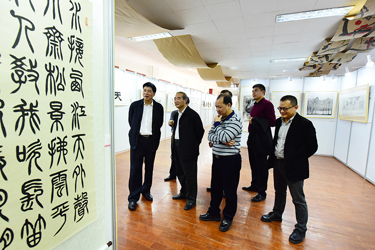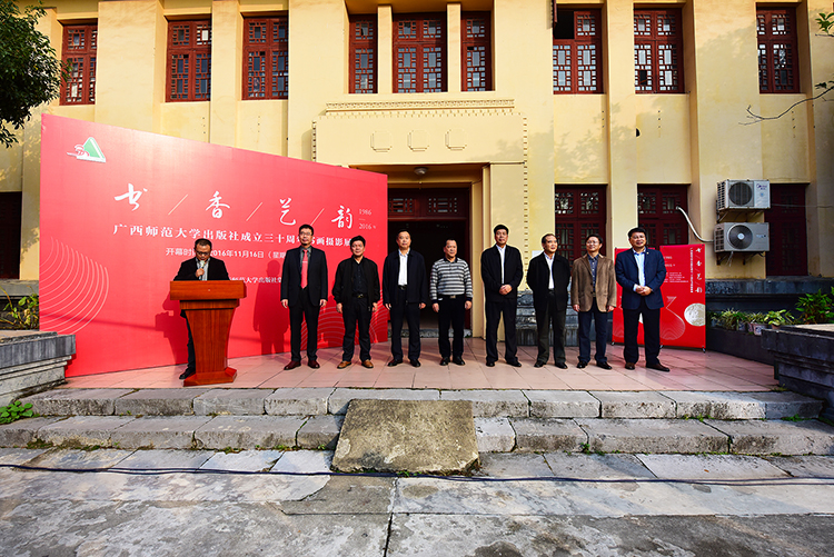 11月18日,是广西师范大学出版社成立三十周年的纪念日。为迎接这一特殊的时刻,促进文化艺术交流,感恩作者与出版社同人,丰富企业文化内涵,展示出版人的艺术风采,广西师范大学出版社特举办“书香艺韵——广西师范大学出版社成立三十周年书画摄影展”。作为出版社成立三十周年活动之一,该展览于11月16日下午在广西师范大学王城校区内正式开幕。出席开幕式的有桂林市政协党组副书记、常务副主席叶兆泉,桂林市政协副主席、市总工会主席罗永东,广西师范大学副校长、桂林市美术家协会名誉主席白晓军,原桂林市政协党组成员、桂林书法家协会主席黄家城,桂林市社科联主席隆斌,桂林市文联主席何绍连,广西师范大学出版社集团党委书记、董事长张艺兵,广西师范大学出版社集团总裁姜革文,以及林汉涛、唐长兴、滕彬等书画摄影界嘉宾。