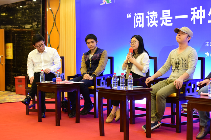 活动分为两个环节,第一个环节是由广西师范大学出版社集团总编助理范新先生主持,出版社的编辑和读者对谈。在对谈环节上,来自深圳的教师吴丙年、来自上海的在读研究生俞诗逸、来自湖南的公益人刘思诗作为读者代表,并结合自身的阅读经历和编辑对谈,就“阅读与成长”、“深阅读与浅阅读”、“图书宣传与推广”等话题进行了深入的探讨。