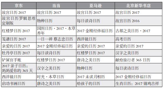 三大图书电商及北京新华书店日历书销量及人气TOP10