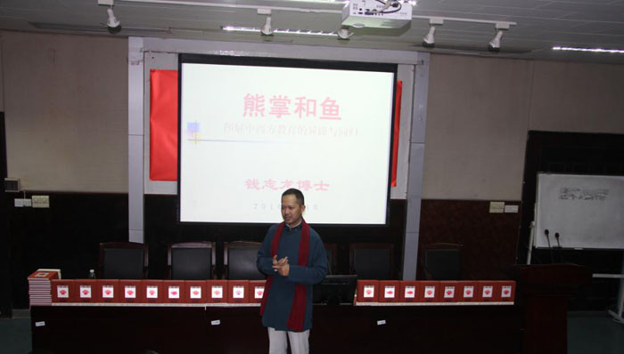 2016年12月10日,培德书院国际学校总校长钱志龙博士携新书《鱼和熊掌——图解中西方教育的异路与同归》来到了南京师范大学大随园校区,在国际教育学院报告厅做了一场精彩纷呈的讲座。本次报告丶新书发布会由南京师范大学出版社戴联荣副总编主持。