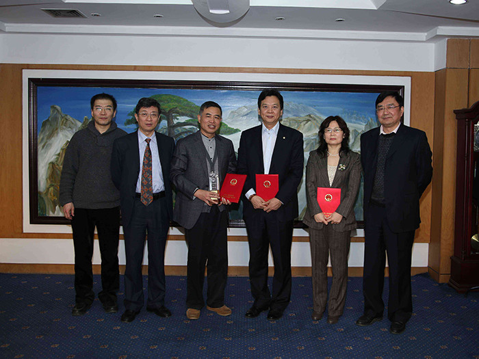 吴培华(右一)与清华社社长宗俊峰(右三)、书记李勇(左二)等参 加“第三届中国出版政府奖”获奖图书座谈会。