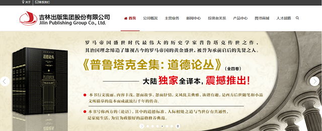 第二,出版集团官网普遍忽视banner建设。作为出版集团官网,充分展示企业形象可谓是第一任务,banner对于一个网站而言,仿若服装店的橱窗,是形象展示的重要阵地。目前流行的banner设计,是采用轮播图方式,以风格统一的大幅图片,辅以动画效果,给人以磅礴大气的视觉感受。令人遗憾的是,国内出版集团官网能做好banner建设的寥寥无几,许多出版集团官网干脆没有banner,更多的出版集团官网banner区域只有一张静态背景图。在这方面做得较好的是安徽出版集团、上海世纪出版集团、吉林出版集团和中国科技出版集团,但其中只有吉林出版集团与中国科技出版集团勉强做到了banner风格、排版与配色的统一。