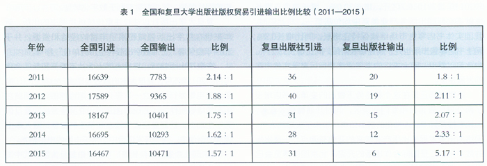 从国家新闻出版广电总局官网2011-2015全国新闻出版业基本情:lll来看,引进版权和输出版权的数据比例5年内从2.14 :1到1.57 :1,可以看出全国出版业版权输出的比例在不断增大,见表1。