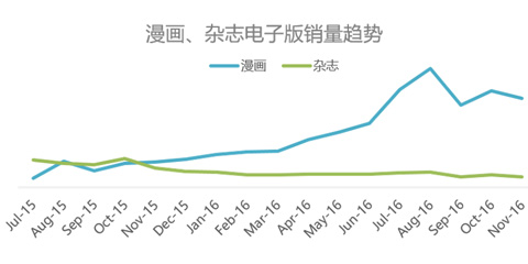 掌阅平台上既有网络文学、出版电子书,也有热门杂志、时尚期刊和漫画。在2016年,杂志销量增长缓慢,但二次元漫画,尤其是制作精良的国产漫画呈爆发式增长。以热门漫画《微微一笑很倾城》为例,是00后的最爱,90%的读者是女性用户,广东阅读比例最高。