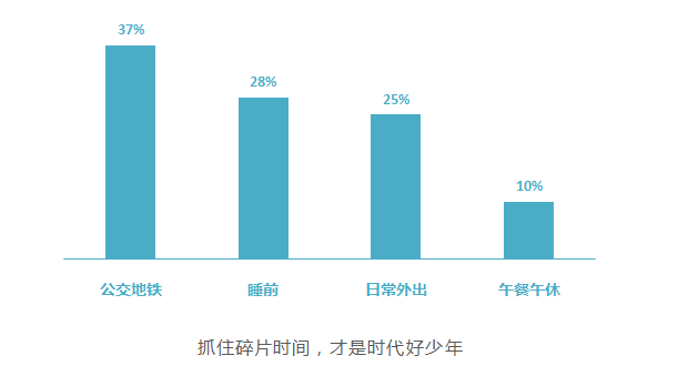 抓住一切碎片时间阅读,是青年读者渴望阅读的另一个表现。在青年读者的阅读场景中,37%是在上下班的公交地铁上,28%是在睡前,25%是日常外出的碎片时段,10%是午餐午休时段。