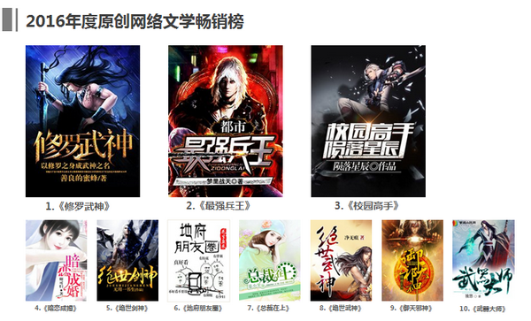 2016年也是原创文学在掌阅平台爆发的一年。诸如《修罗武神》、《最强兵王》等网络文学原创小说表现出极强的读者吸引力,聚集了百万粉丝热切关注。掌阅的第一届文学大赛更是推出了一批自出版的原创小说,如《鱼在水里唱着歌》、《风尘志》等。