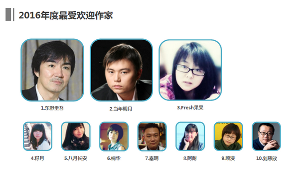 2016年度最受欢迎作家榜与畅销榜基本一致,他们分别是:东野圭吾、当年明月、fresh果果、籽月、八月长安、桐华、秦明、阿耐、顾漫、刘慈欣。