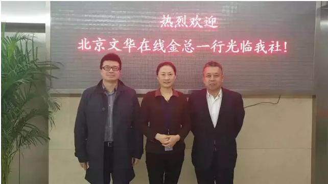南京大学出版社副总编辑薛志红(中)与文华在线董事长金善国(左)、互动教材事业部总经理李蜀丰(右)合影留念。