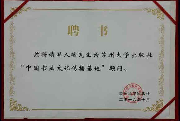 日前,在苏州市书法家协会书法教育2017新春座谈会上,苏州大学教授、博士生导师华人德受聘为苏州市书协、苏州大学出版社合作共建的中国书法文化传播基地顾问。受聘仪式由苏州市书法家协会主席王伟林主持,苏州大学出版社董事长张建初为华人德教授颁发了聘书。仪式结束后,华人德教授就书法文化传播基地建设和书法类图书选题策划提出了宝贵的意见和建议。