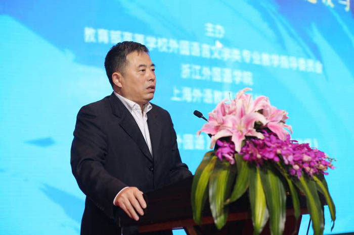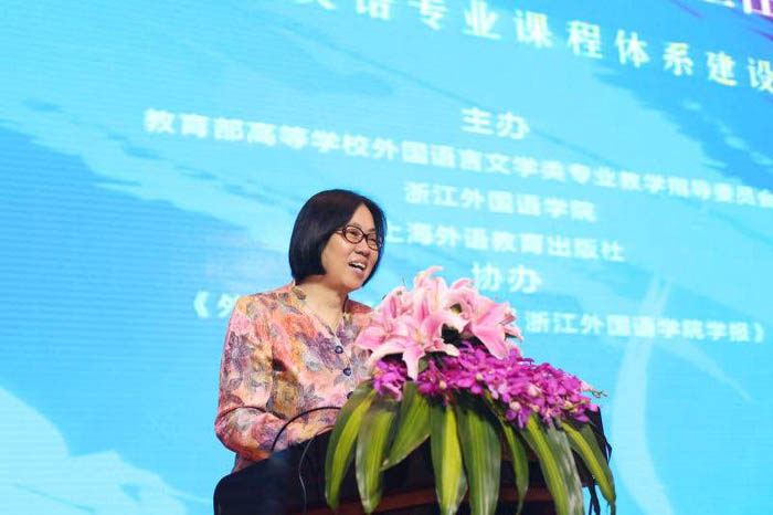 教育部高等学校外国语言文学类专业教学指导委员会主任委员钟美荪教授致辞并作了发言,扼要阐述了《国标》制定的背景、要求与主要理念。