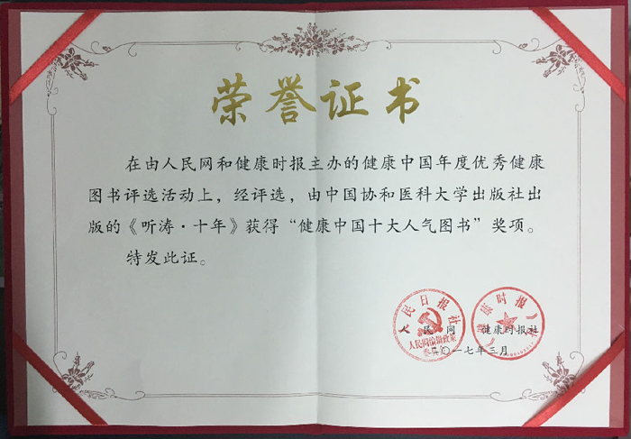 评选发布会上揭晓了2016年度“健康中国年度十大图书”和“健康中国十大人气图书”。在此次评选中,中国协和医科大学出版社编辑出版的《听涛·十年》入选“健康中国年度十大图书”榜单,《听涛·十年》和《炼狱三年-女医生美国行医记事》同时入选“健康中国十大人气图书”榜单。
