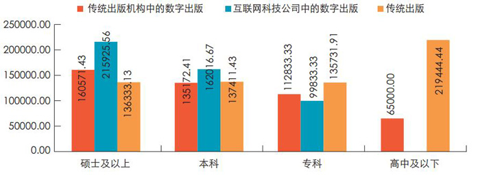图2 2016 年传统出版与数字出版从业者学历与收入对比情况(单位:元)
