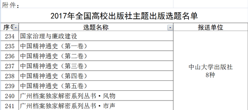 中山大学出版社8项选题入选“教育部2017年全国高校出版社主题出版选题”。