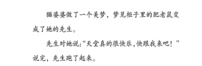 死亡是每个人都要学会面对的生命课题,很多人在至亲离世后无法面对事实,导致生活陷入痛苦。《猫婆婆》以一只肥老鼠寓意为猫婆婆已故的先生,以墙上的猫表现猫婆婆的内心活动,展现了猫婆婆对已故先生的过度怀念。猫婆婆不懂得如何走出丧偶的阴影,作为一个沉溺于悲伤的人,她渴望得到拯救。她的子女深爱着她,努力善待她,却无法读懂她的心。最终,猫婆婆在郁郁寡欢中抱病离世。