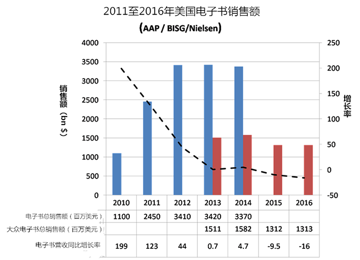 美国电子书销售经历了最初的井喷之后增长趋于停滞,不过以上数据主要来自传统出版商,没有涵盖自出版销售情况。