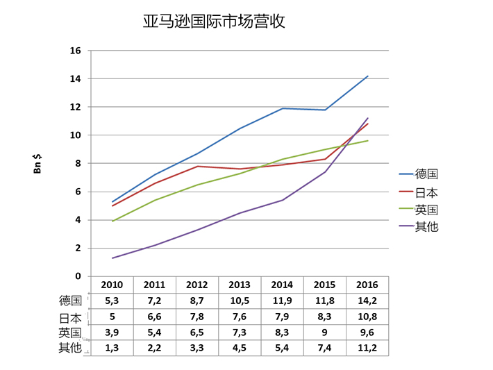 亚马逊全球化势头加强,除德国、英国和日本以外,世界其他国家和地区所贡献的营收在亚马逊整体营收中的份额已经从2010年的8%上升到2016年的24%。