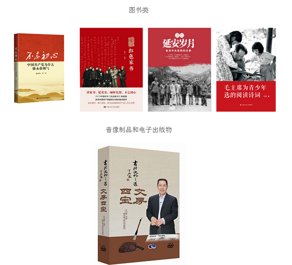 人大社入选的出版物有:图书类包括《不忘初心:中国共产党为什么能永葆朝气》(作者:黄相怀等),《图说红色家书》(作者:张丁),《亲历延安岁月:延安中央医院的往事》(作者:金星),《毛主席为青少年选的阅读诗词》(作者:叶燕),以及音像制品和电子出版物《文房四宝》(作者:王吉祥)。