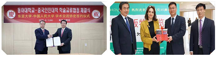 上、左、右分别为人大社访问土耳其伊斯坦布尔大学、与东亚大学签署校际合作协议、 向黎巴嫩大学赠送中国主题图书。