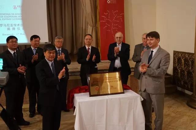 上、左、右分别为中国-罗马尼亚学术出版合作中心揭牌现场、 在蒙古设立的中国主题图书翻译出版中心与以色列分社揭牌。