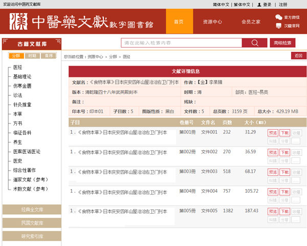 《中医药文献库》最新1.0版,由中医药文献目录库和中医药文献图版库两部分组成,收录14部中医药及其相关文献,包括医经、基础理论、伤寒金匮、诊法、针灸推拿、本草、方书、临证各科、养生、医案医话医论、医史、综合性著作,以及道家、术数参考文献,共计79类。截至2017年9月,中医药文献目录库收录文献约2.2万种,中医药文献图版库收录文献原件4914种,约470万页,数据量约1TB。